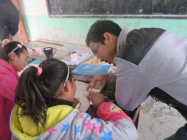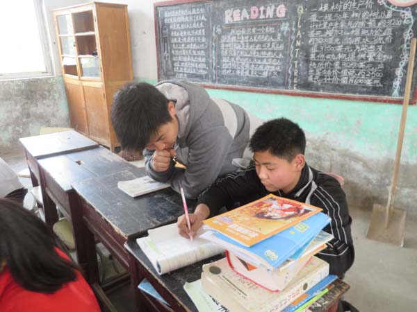 晌午时分,一行人在班长鹿通的带领下来到了桥上中学,值班老师热情地接待了来访的同学们。随后,同学们各自分组,分别前往三个年级不同的班级。在那里,孩子们满心欢喜地等待着。正是自习时分,孩子们都在专心地完成老师布置的作业。于是,同学们一边和孩子们交谈一边辅导他们。当得知很多孩子觉得学习压力太大时,王晓霞同学微笑地讲述了她上学时风雨无阻的情况,鼓励孩子们不要灰心,相信天道酬勤。她的一番讲话仿佛又重新燃起孩子们对知识的渴望。窗外,阵阵笑声像一群白鸽缭绕在操场上。鹿通正带领着初三毕业班的同学在操场运动,让久于埋头备考的同学放松心情,暂时忘记烦恼。同时,唐源同学还为同学们变了一个小魔术,他滑稽的表情逗得在场的同学们捧腹大笑。最后,鹿通向学校捐赠了带来的体育器材并预祝他们奋发向上,在中考中取得优异的成绩。