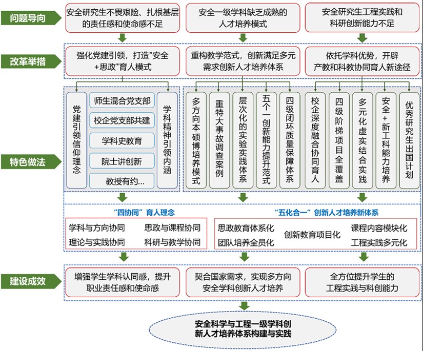《安全科学与工程一流创新人才培养体系构建与实践》成果以服务国家战略需求为导向,挖掘“艰苦奋斗、甘于奉献”的学科奋斗史和精神内涵,构建了体系化“安全+思政”育人新模式。围绕学科方向调整下的立德树人和创新人才培养目标,创新教学模式,创造性提出了“四协同”人才培养理念;从“党建引领、育人模式、产教融合、科教融合”四个维度入手,构建思政教育体系化、课程内容模块化、团队培养全员化、工程实践多元化、创新教育项目化“五化合一”的安全学科创新人才培养体系。以A+学科优势赋能科教产教双融合,推动重大“平台—团队—项目”联动育人,培养契合国家重大战略和产业升级需的高层次安全人才。