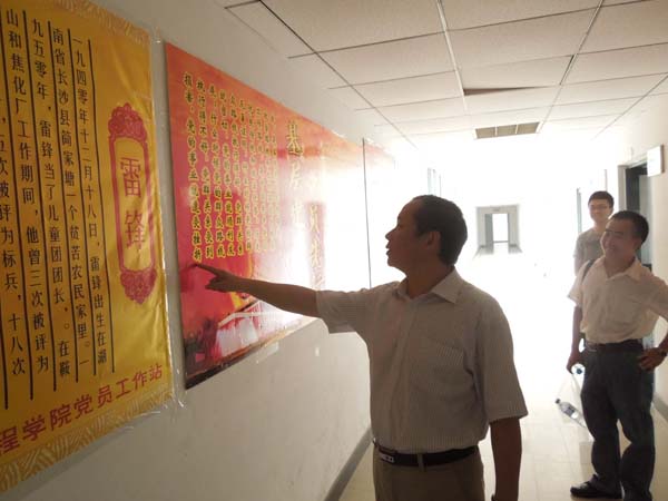 院领导首先察看了学生公寓党员工作站公示栏,然后详细询问了党员工作站的建设情况、工作开展情况。视察过程中,章书记指出学生党员工作站是重要的党员服务窗口,对于发挥党组织引导人、团结人、凝聚人的作用有着不可替代的作用;他表示,要使工作站真正发挥预想的作用,不能仅仅停留在表面、形式上,更主要的是要将学生党员工作站的各项规章制度落到实处,使广大同学在学生党员的带领下,丰富业余生活,提高思想内涵,自觉营造积极向上的文化氛围。