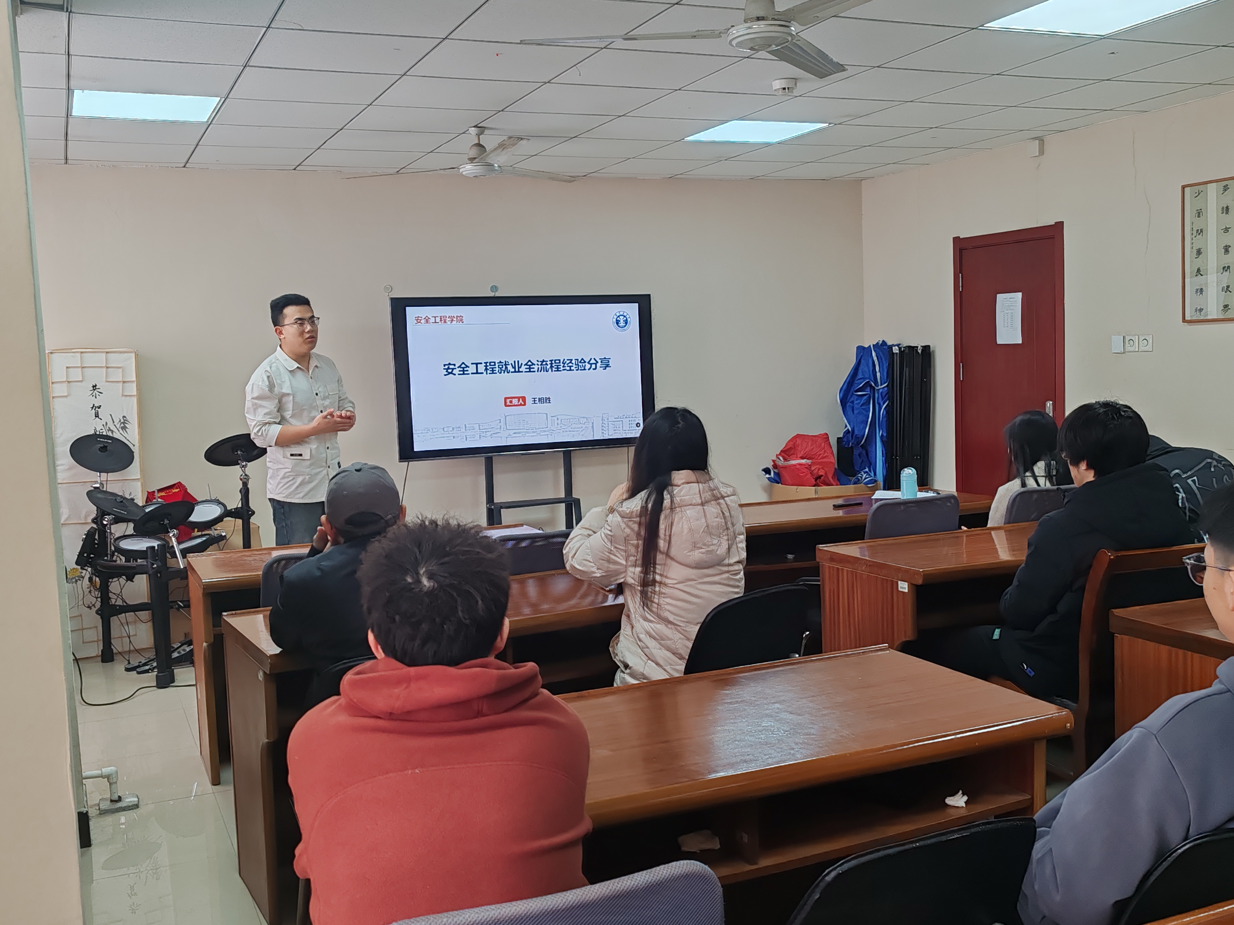 首先,由王相胜进行安全工程就业全流程经验分享。王相胜分别从安全工程专业所学内容、就业方向以及如何获得就业机会等方面进行阐述。他对就业时可能面临的问题进行了详细叙述,如求职初期简历投递石沉大海时应该调整心态、重整旗鼓;在面试环节,面对专业面试官时要冷静沉着;亦或是在职业选择时,如何在不同行业、不同企业规模间进行取舍,对于平衡薪资待遇、发展空间与个人兴趣等问题,他都结合个人经历进行了细致入微的讲解。接着,陈思睿为大家介绍面试全过程。他以亲历者的视角逐个还原面试中的每一个环节、每一处细节,让同学们能够身临其境,对面试环节由陌生变为熟知。他建议大家在面试前根据不同类型公司灵活调整准备内容,鼓励同学们坚定自信。最后,他们对大家的问题进行一一解答,帮助同学们理出清晰就业思路。