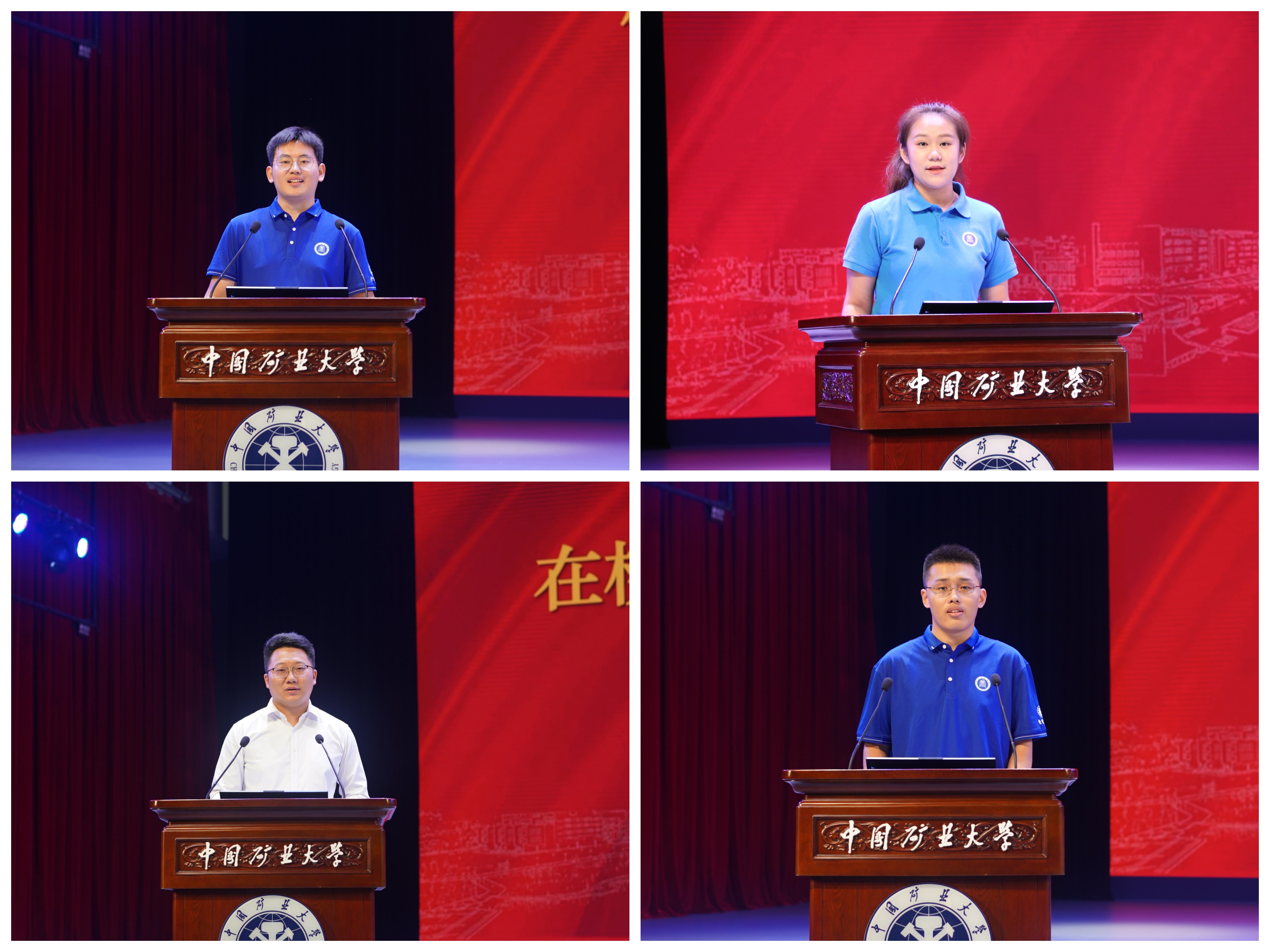 青年教师代表郭峰研究员结合自己在矿大求学及工作经历,勉励新生以终为始,用长远目标倒推关键子目标、规划自己的大学或者研究生生涯,学会独立思考、独立解决问题,培养独立人格。在校生代表2021级博士施宇分享了他在矿大求学八年中的感悟。他结合自己的成长轨迹,叮嘱学弟学妹,要坚守初心使命、磨练坚强意志,更要传承矿大精神,用一腔热血和担当回报父母,建设矿大,报效祖国。在校生代表职业卫生工程2021级1班安美颐同学结合自身专业学习感悟,鼓励新生可以保持一颗好奇的心,勇于尝试新事物,不畏失败,敢于在探索中发现自己真正的兴趣与潜能。新生代表2024级直博生毛紫浩讲述了自己选择留在安全学院继续继续追逐科研梦想的初心,并表示在以后得学习生活中要树立远大理想,挖掘自身的潜力,不断提高独立思考、团队协作、语言表达等能力,努力成长为可堪民族复兴大任的时代新人。新生代表安全科学与工程类2024级4班董泊江同学讲述了自己和矿大的缘分和初入大学的感受,并向全体新生发出倡议:作为矿大安全学子要秉持“开拓创新,追求卓越”的院训,尽快适应大学新的环境,以更加饱满的热情、更加坚定的信念,投入到即将开始的大学生活中去。
